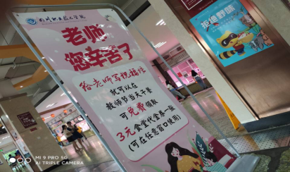 除此以外,教师节当天学院食堂还提供了节日福利,主要内容是:中午在学生窗口,分别推出特价菜香辣兔丁(100斤)只售2.5元/份 、红烧肉(60斤)只卖 2.5元/份。同时中午在二食堂大厅还开展“感恩教师节”活动,学生们参与活动可免费领取一张3元的食堂代金劵,教师节当天可在食堂的任意打饭窗口使用。