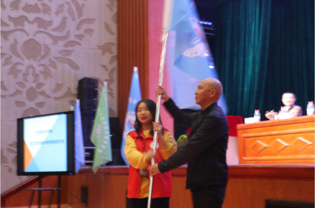 会上,江涛处长代表学院生活垃圾强制分类领导小组向学生志愿者授旗。