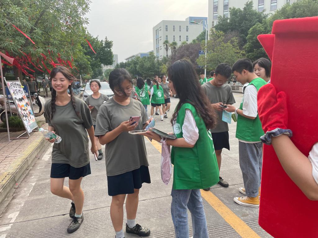 本次活动采用线上线下同时宣传的方式开展。线上通过学生班级微信群、QQ群、校园显示屏开展垃圾分类知识的学习和宣传。线下主要借助新生军训现场,协会的志愿者走进了新生军训的队伍,通过知识问答、现场讲解、分发宣传手册等方式,与新同学面对面近距离的讲解垃圾分类的重要性,倡导新生养成将生活垃圾分类的良好习惯,引导新生积极参与到垃圾分类工作中,共同构建我们美好的校园环境。