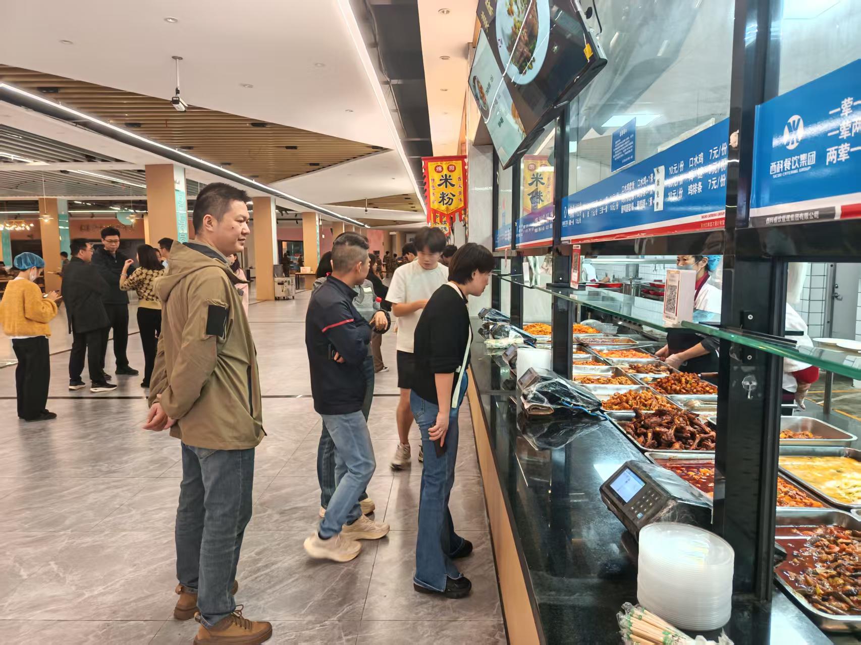 座谈会结束后,潘宏、蒋艺溱一行还实地走访了我校的教职工食堂和学生食堂、美食城及商业街进行现场考察。