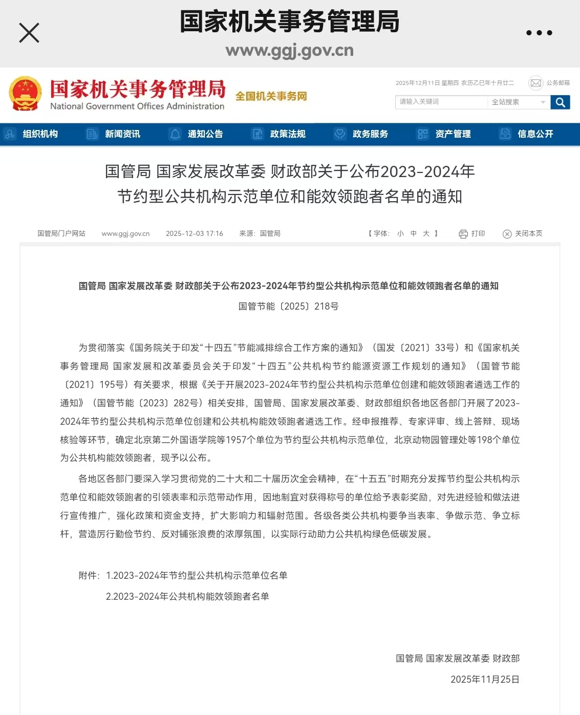 近日,国家机关事务管理局、国家发展改革委、财政部联合印发国管节能〔2025〕218号文件,正式公布2023—2024年节约型公共机构示范单位名单,我校成功上榜。活动自2023年12月启动以来,历经申报推荐、专家评审、线上答辩、现场核验等多轮严苛遴选,最终确定入选名单。此次学校成功“摘牌”,标志着我校绿色低碳发展实现历史性突破。